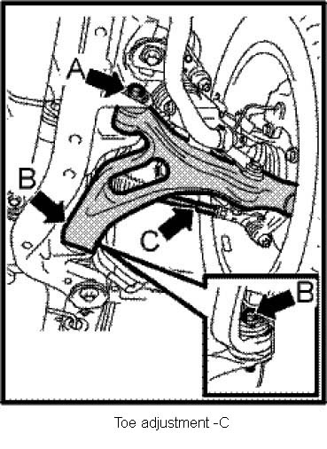 The toe is adjusted at the tie rod threaded joint for the tie rod/tie rod ball (ball joint) -C-.
