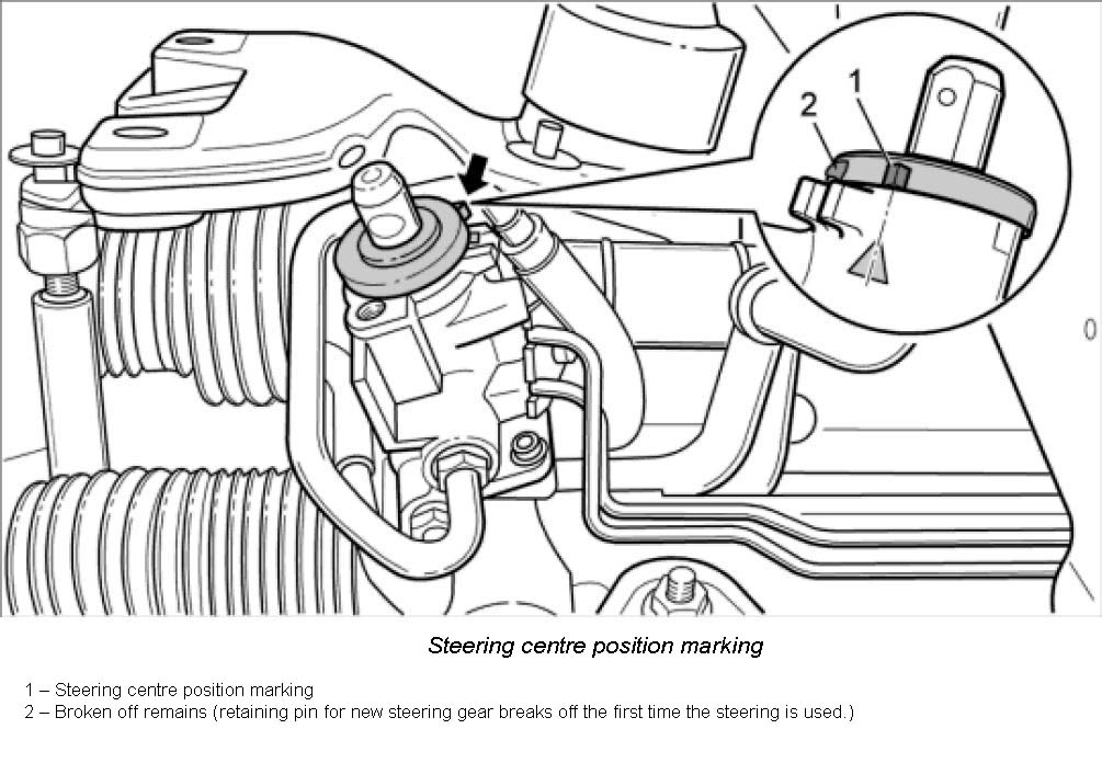 5. The steering center position marking -1- is under the heat shield at the front in the direction of travel on the steering gear housing (shown here looking in the direction of travel on a removed unit for clarity).