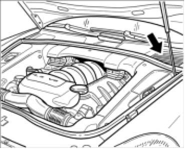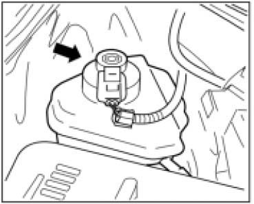 Visually inspect brake fluid level. The brake fluid level must be between the MAX and MIN markings. The brake fluid reservoir is located under the left plenum panel cover -arrow-.