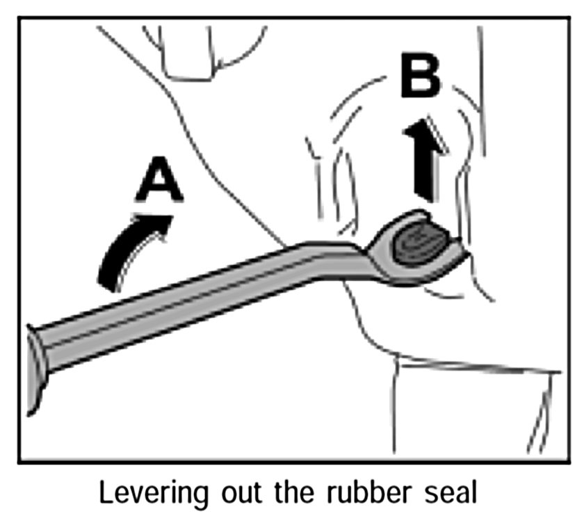 4. Remove rubber seal -arrow B- using a removal tool, universal NR.21 to lever it out of the tank -arrow A-.