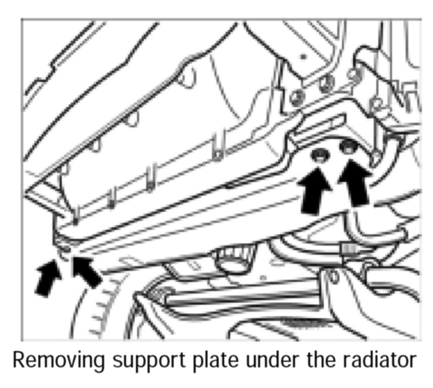 1. Remove the support plate under the radiator. To do this, loosen the four fastening screws.