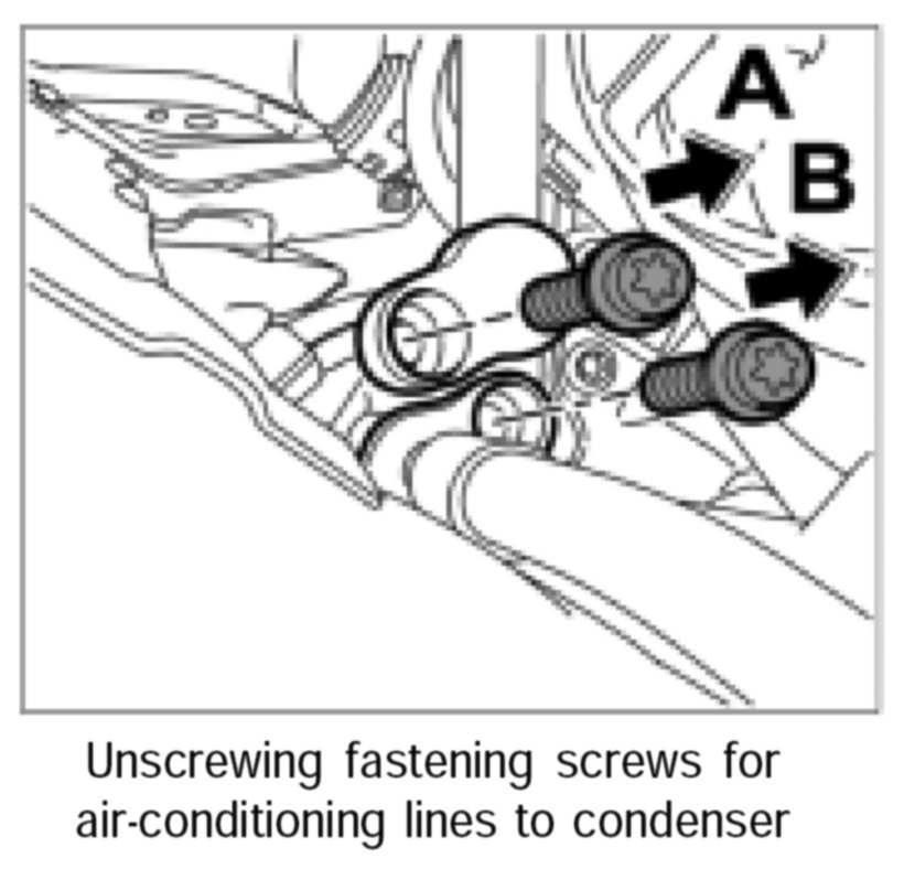 2. Unscrew the fastening screws -A and B- for the air-conditioning lines to the condenser, remove the lines and close them off so that they are air-tight.