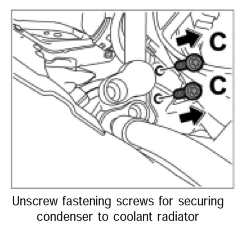 3. Unscrew both fastening screws -C- for securing condenser to the coolant radiator (left direction of travel).
