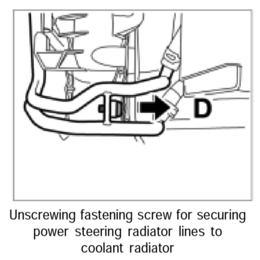 4. Unscrew the fastening screw -D- (left direction of travel) for securing power steering radiator lines to coolant radiator.