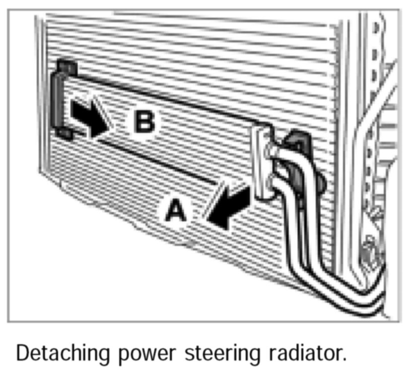 6. Detach power steering radiator from condenser -Arrow A- and remove from the support -Arrow B-.