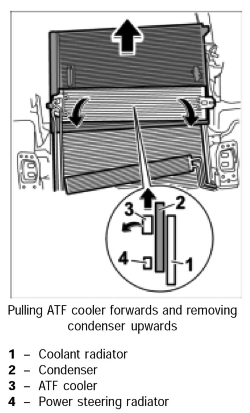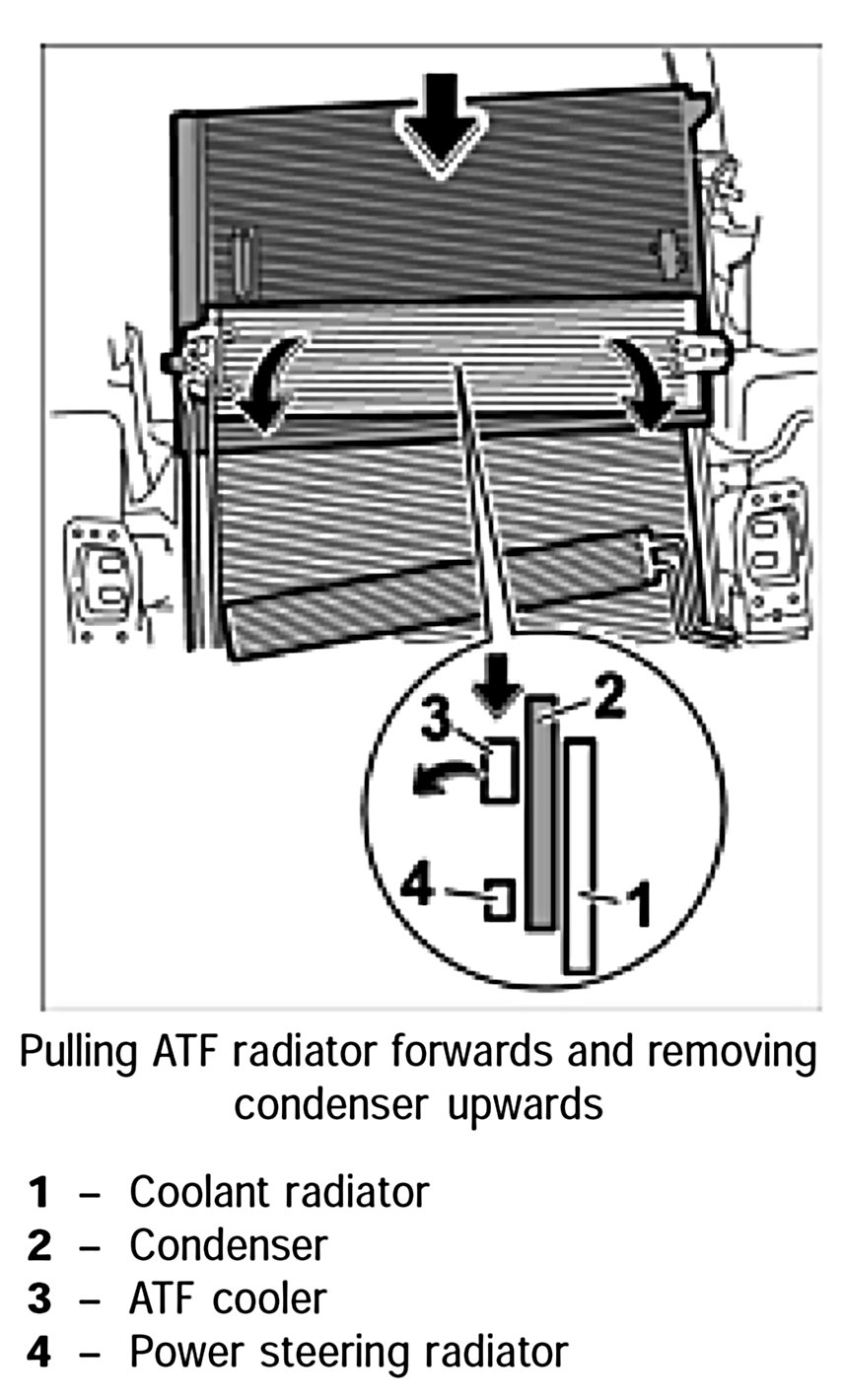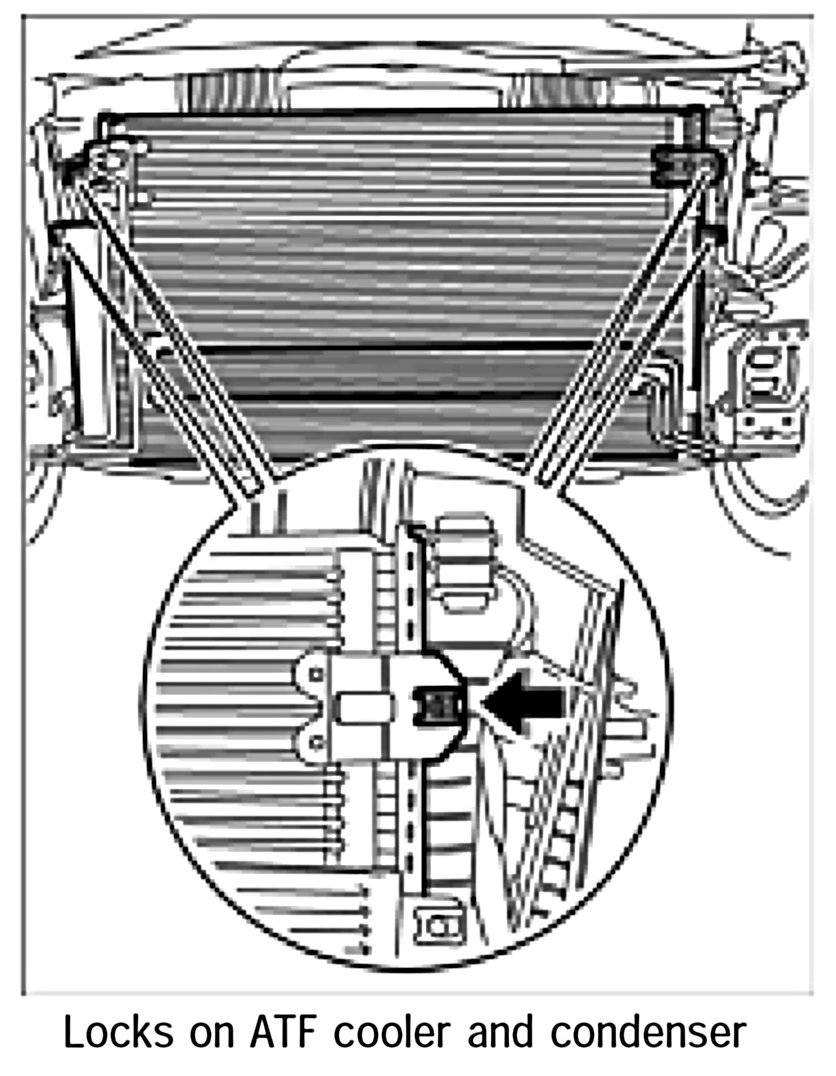 3. Engage the condenser and the ATF cooler in the mounts and clip in both retaining clips on the condenser and on the coolant radiator.
