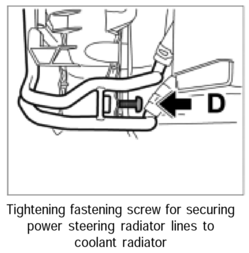 5. Screw in the fastening screw -Arrow D- (left direction of travel) for securing power steering radiator lines to coolant radiator. Tightening torque: 6 ftlb.