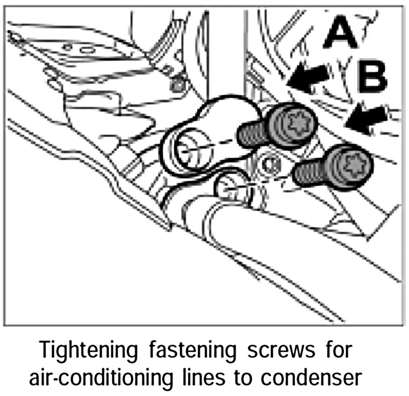 7. Position the refrigerant lines and attach them to the condenser with the fastening screws -A and B-. Tightening torque: 9 ftlb.