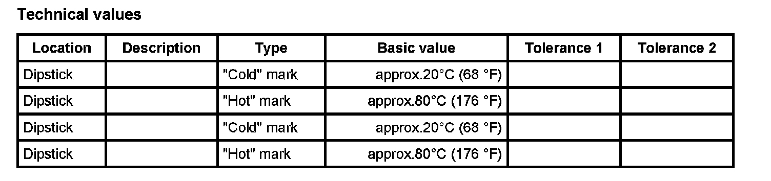 There are two markings on the dipstick located on the cap. One area is marked "Cold" for when the engine is cold -"Cold" mark: approx. 20°C (68°F) and the other is marked "Hot" for when the engine is warmed up -> "Hot" mark: approx. 80°C (176°F).