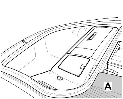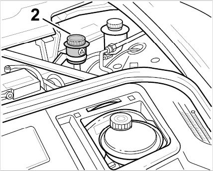 A second supply tank (Pentosin reservoir) -2- for the clutch actuating hydraulic system can also be found in the luggage compartment area. This second reservoir -2- is located under the left cover -A-. On righthand drive vehicles it is located under the right cover.