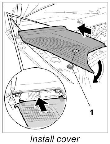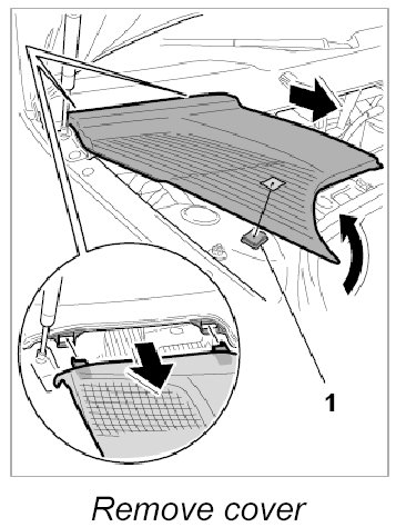1. Lift rubber lip of luggage compartment seal to one side, lift up the cover and disengage it from cowl panel cover.