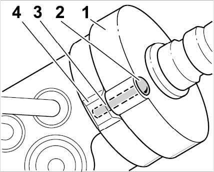 No. 3 is the desired breaking point for bolts in new steering gears. The (new) bolt -2- is inserted into driver -1- and lies with its underside in lug -4-. This locks the steering gear in the centre position. After installation of a new steering gear, the lower part of the bolt is sheared off (at desired breaking point -3-) by turning the steering wheel. The upper part of the bolt -2- remains in the driver.