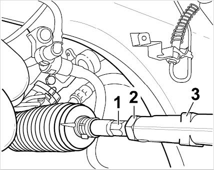 Loosen tie rod lock nut(s) -2-. When loosening and tightening the tie rod lock nut(s) counter on the square of the tie rod -3-, with an open ended wrench. Then adjust the toe on the hexagon -1- of the tie rod(s). Then tighten the tie rod lock nut(s) -2- to the prescribed tightening torque.