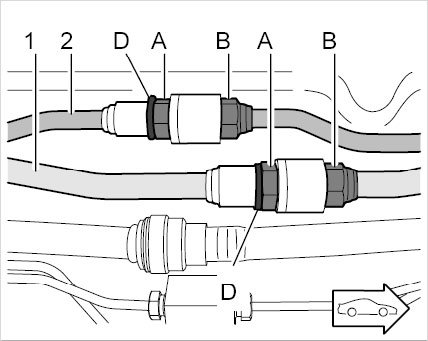 Plug-in coupling is loosened by screwing it apart. (Remove circlip -D/turn at the threaded joint -A- and counter at the hexagon on the plug-in coupling -B- at the same time).