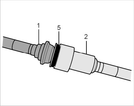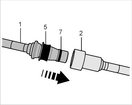 Pull on the connector -1- to check that the plug-in coupling is locked (push and pull slightly in axial direction). Counter at the plug-in sleeve -2- while doing this. If the plug-in coupling is locked correctly, you should be able to feel slight axial play between the connector -1- and plug-in sleeve -2-. A plug-in coupling cannot be partly locked. Another sure sign of a correctly locked plug-in coupling is the bulbous shape of the axial spring -5-.