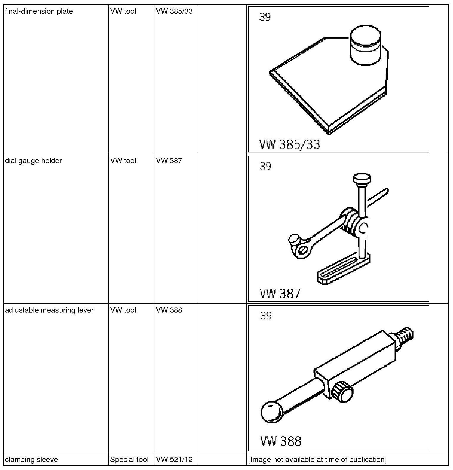 5. Complete measuring mandrel VW 385/ 1. A dial-gauge extension of approx. 12 mm in length must be fitted in the gauge plunger VW 385/14.