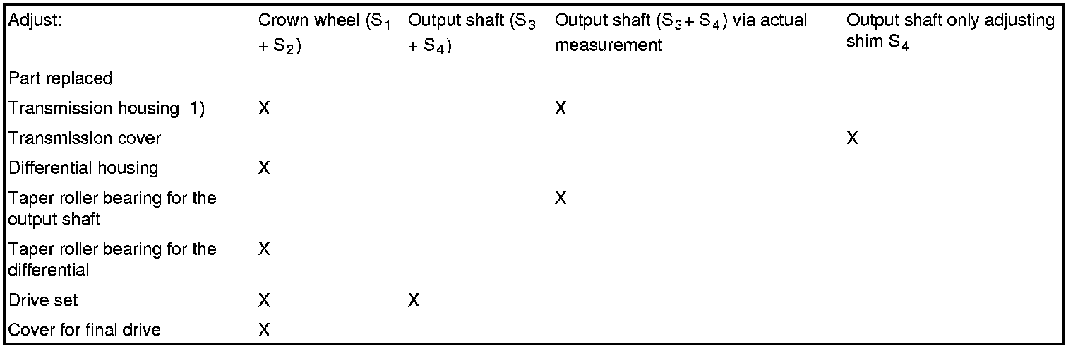 When carrying out assembly work on the final drive, re-adjustment of the output shaft and crown wheel or drive set is necessary only if parts are being replaced which directly influence the adjustment of the final drive. To avoid unnecessary adjustment work, proceed according to the following table: