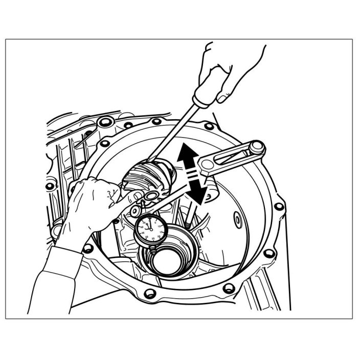 7. Undo the screws of the transmission cover and read off the dial gauge. If the adjusting shims were selected correctly, the dial gauge must display a value between 0.08 mm and 0.15 mm.