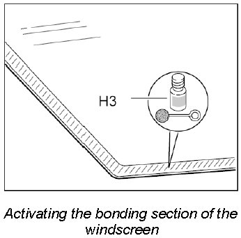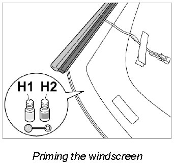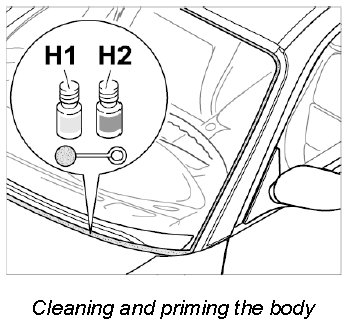 1. Clean areas that are free of adhesive residue or have new paint or where there is damage to the top coat paint in the non-visible area of the window aperture in the body with cleaning solution -H1- and touch up with primers -H2-.