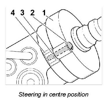 No. 3 is the desired breaking point for bolts in new steering gears. The (new) bolt -2- is inserted into driver -1- and lies with its underside in lug -4-. This locks the steering gear in the center position. After installation of a new steering gear, the lower part of the bolt is sheared off (at desired breaking point -3- ) by turning the steering wheel. The upper part of the bolt -2- remains in the driver.