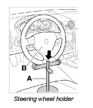 Clamp steering wheel in center position with steering wheel holder -A-. Use only steering wheel holders that do not project into the area of the airbag unit -B-! If necessary, shorten the guiding rod of the steering wheel holder at top -Arrow-.