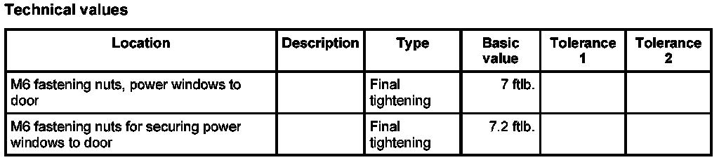 2. First position the lower fastening points of the power windows -1- to the dimension -X = 5 mm- and tighten with fastening nuts - 2-. Tightening torque: Final tightening : 7 ftlb.