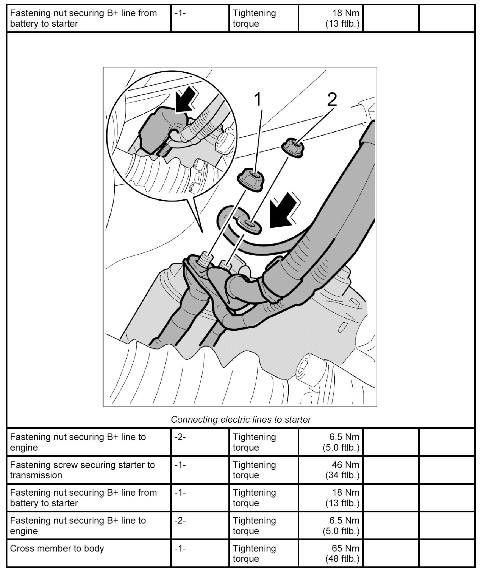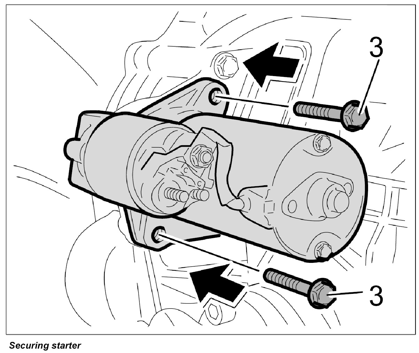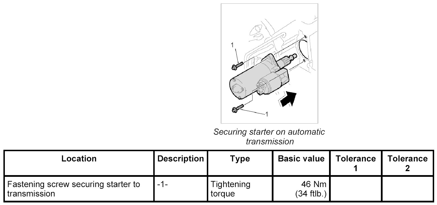 1. Position starter on the transmission and secure in place with the two fastening screws -3-. Tightening torque: 46 Nm (34 ftlb.)