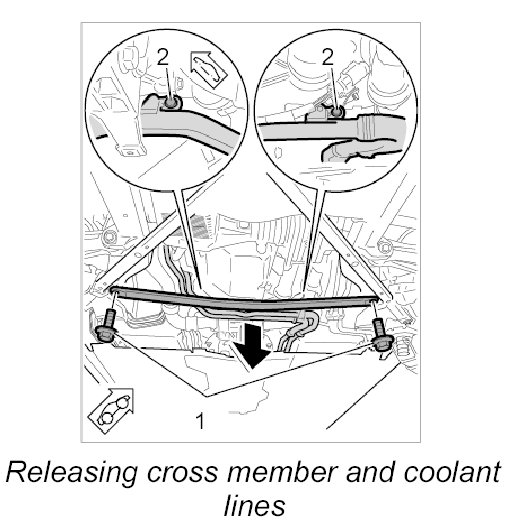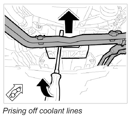 9. Using a screwdriver, prise the coolant lines out of the transmission bracket (in direction of travel to rear). >> The lines can now be easily pulled downwards and to the side.