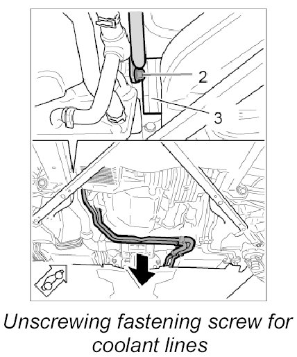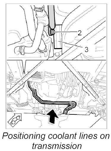 2. Lift the coolant lines over the bracket on the transmission and secure the coolant lines using the fastening screw -2- at the side of the transmission (next to the drive shaft -3- ).