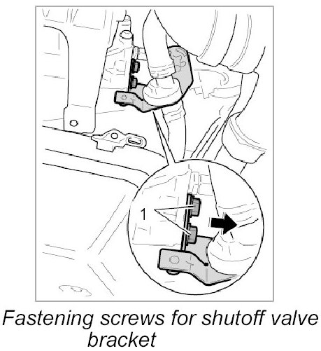 8. Unscrew the two fastening screws for the shutoff valve bracket -1-.