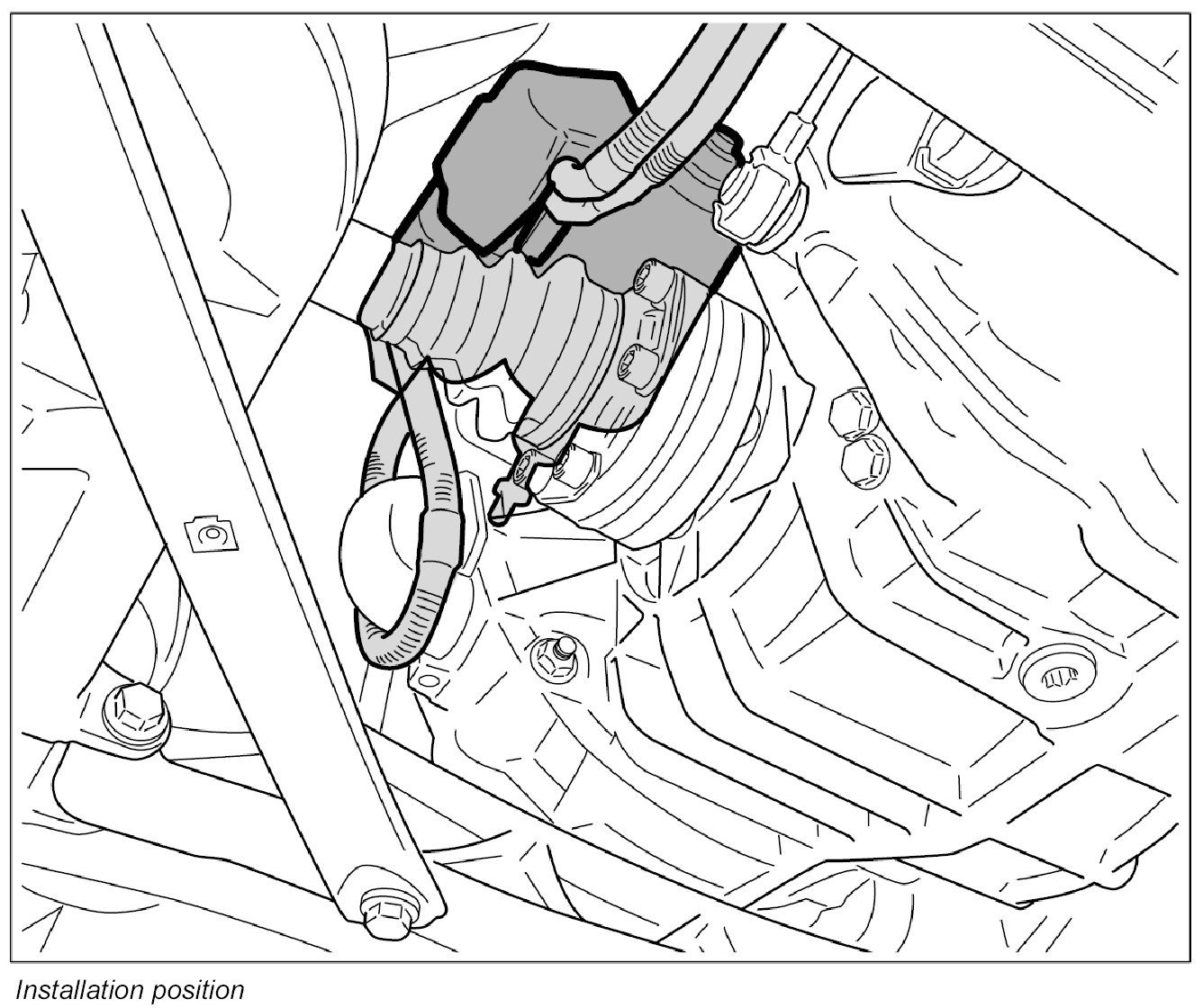 1. Press coolant hoses to one side and slide the starter carefully between the transmission and body, rotate it and insert it into the opening in the transmission.
