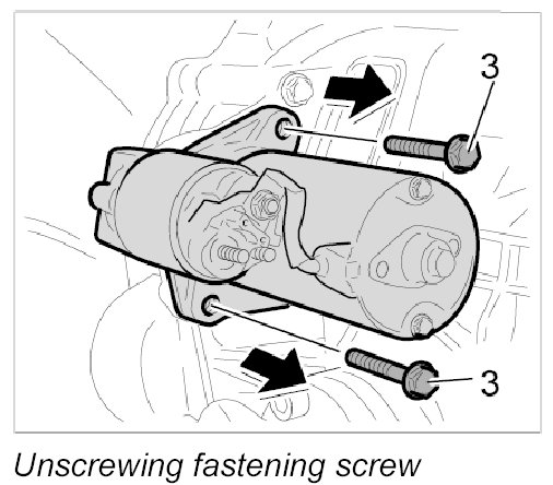 2. Unscrew upper fastening screw on the starter -3-.