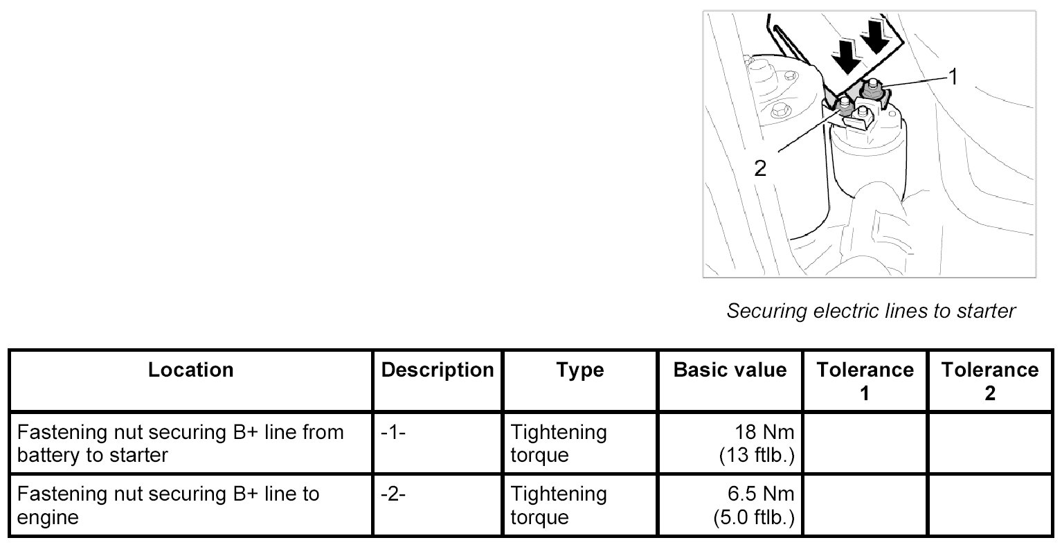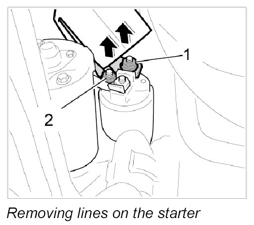 2. Fit B+ line from battery and B+ line from engine B+ connection point to terminal 30 (M8 nut) -1- on the solenoid switch and secure it. Secure line for terminal 50 (M6 nut) -2- to solenoid switch. Tightening torque: 18 Nm (13 ftlb.)