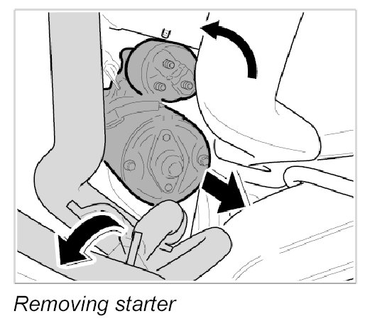 4. Remove the starter from the transmission and turn it so that the solenoid switch is facing towards the halfshaft. Remove starter in a downward direction.