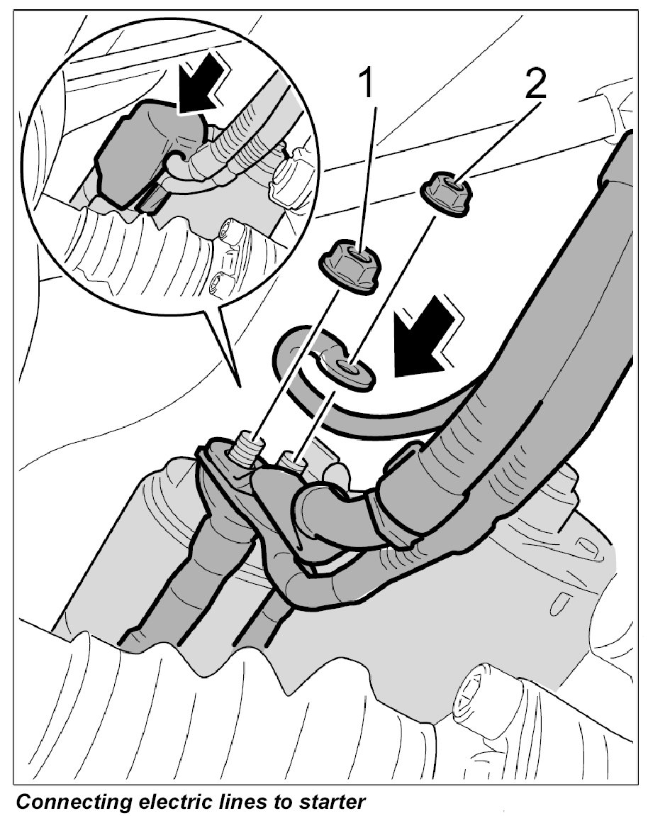 3. Slide the B+ line through the cover, plug electric contacts into the starter and secure using the fastening nuts -1, 2-.