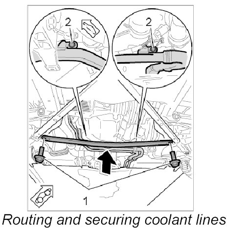 3. Slide the coolant lines in the transmission bracket area back and secure with the two fastening screws -2-.