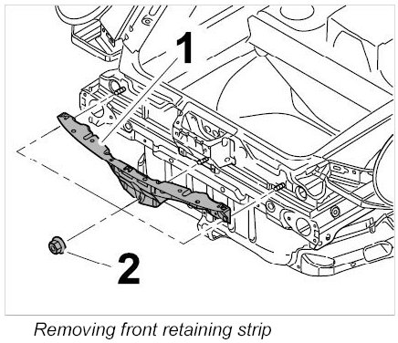1. Unscrew fastening nuts -2- and remove front retaining strip -1-.
