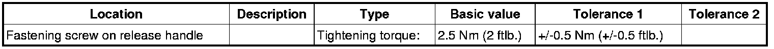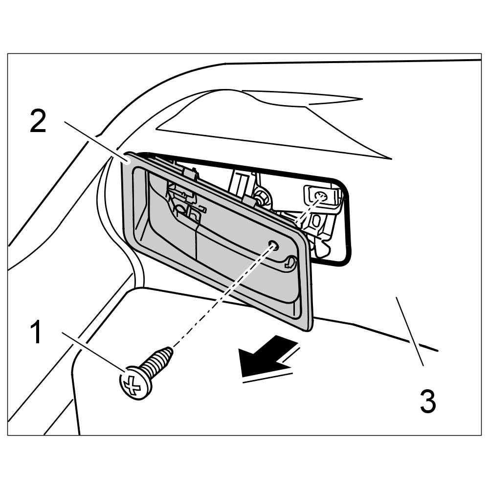 2. Press release handle -2- into the luggage compartment trim -3- and screw in the fastening screw -1-. => Tightening torque:: 2.5 Nm (2 ftlb.)+/-0.5 Nm (+/-0.5 ftlb.)