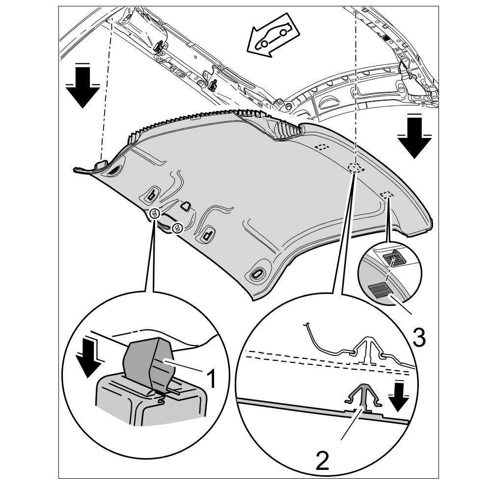 8. Check clamps -1- and fixing clip -2- of headliner -3- for deformation, replace if necessary.