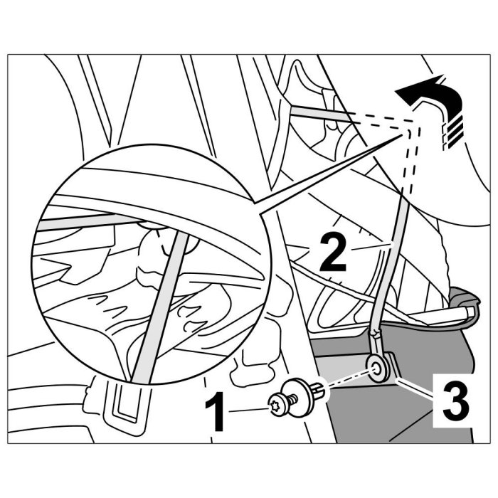 1. Press out plastic expansion rivets -1- at the roof liner connection -2- on the right and left of the tension bow -3-.