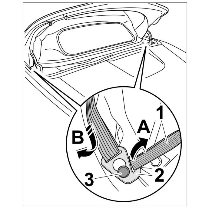 3. Pull hook of roof liner -2- downwards and disengage from the pin for the convertible top support -3- on right and left -Arrow B-.