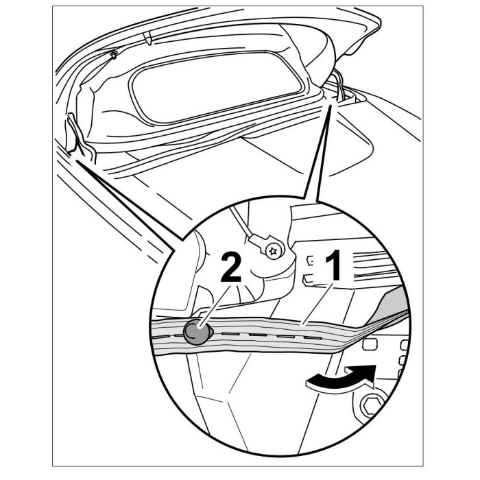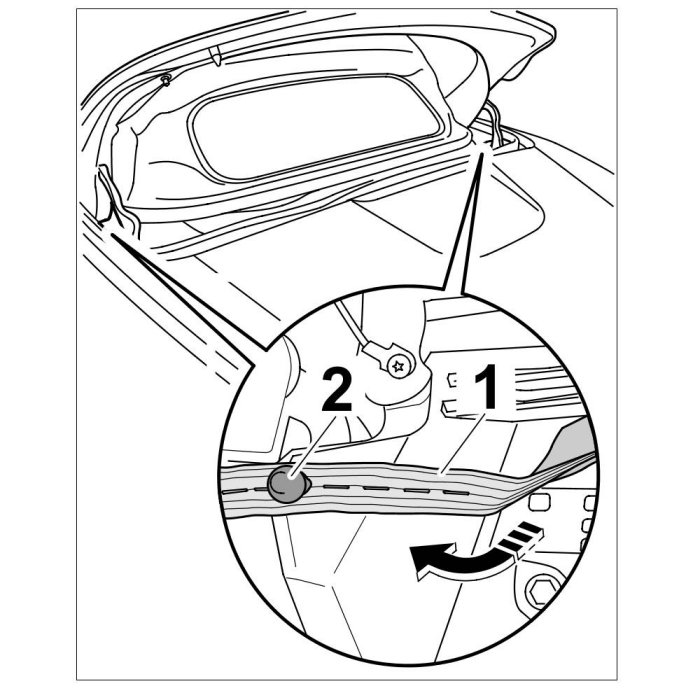 1. Unclip roof liner -1- downwards at front and in centre from bar of roof frame -2- , starting from the outside.