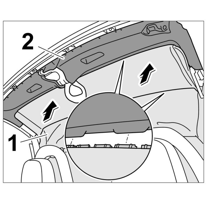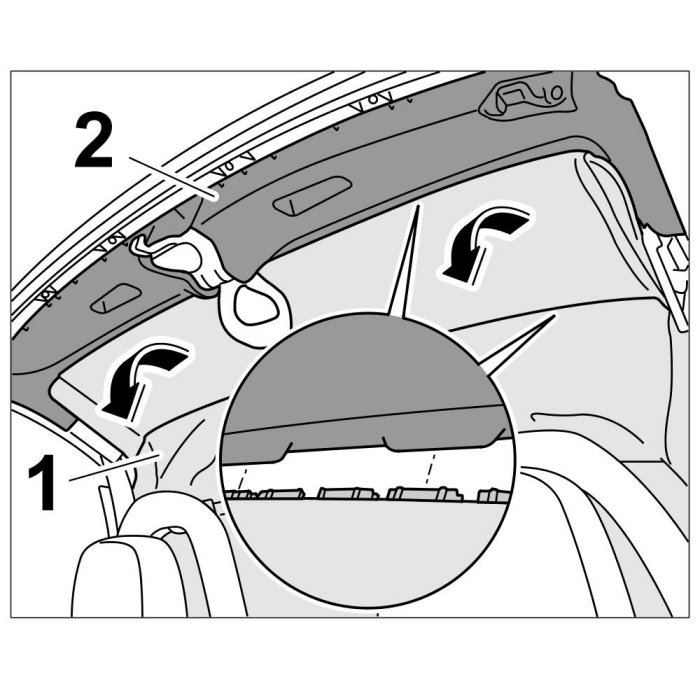 4. Engage cord -1- of roof liner at buffer -2- on right and left B-pillar.