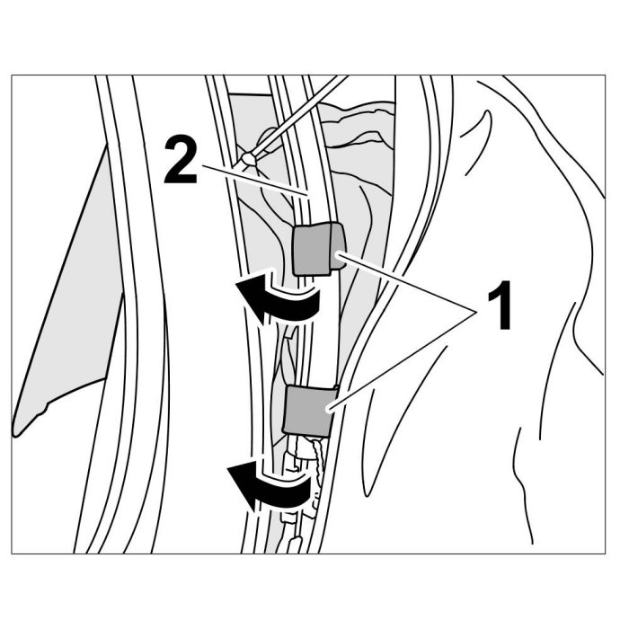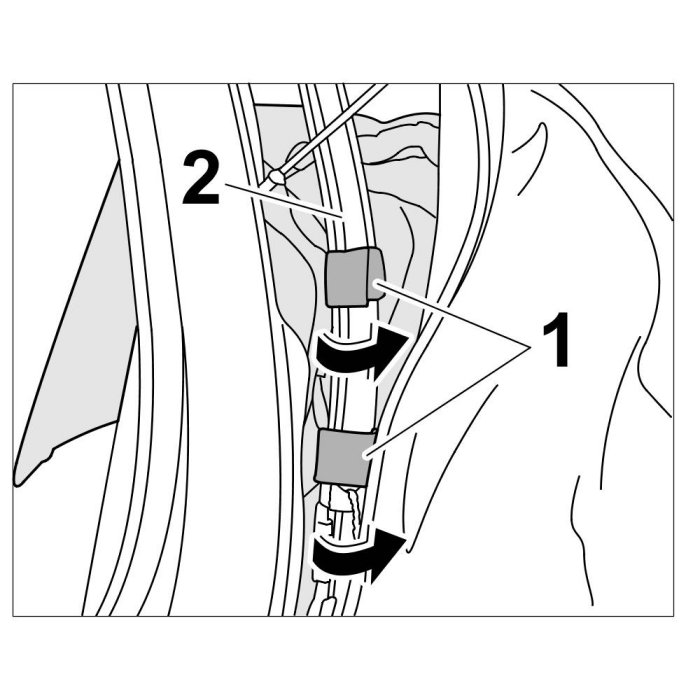 5. Secure Velcro fasteners -1- to the push rod -2- right and left. To do this, position the loop up to the seam of the Velcro strip and press the Velcro firmly together.