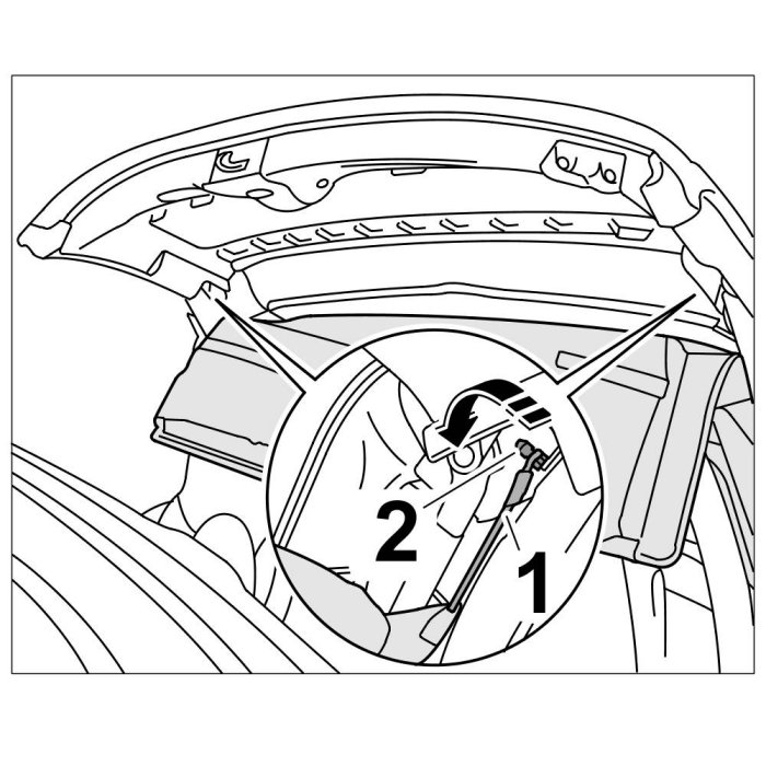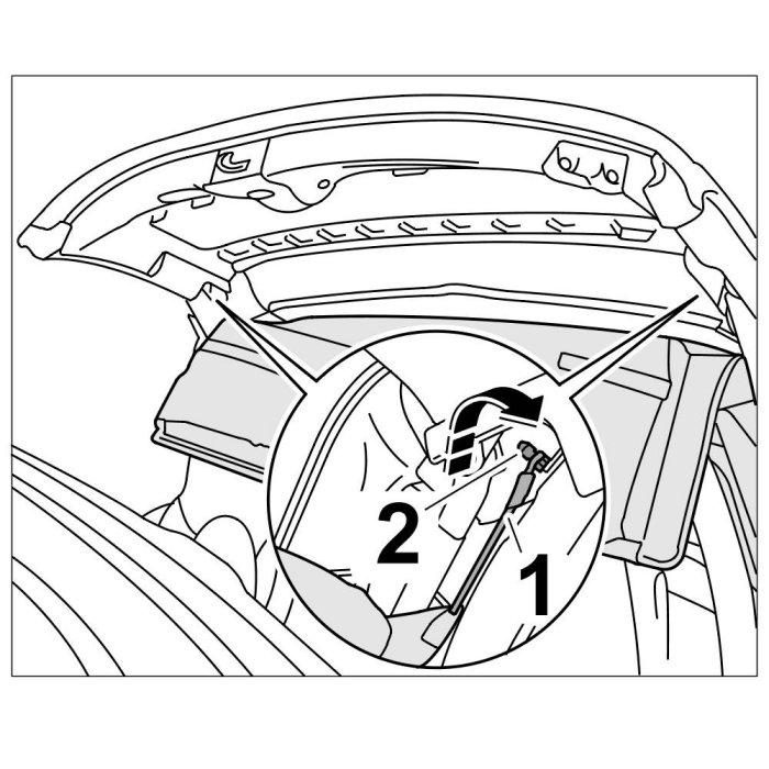 3. Disengage cord -1- of roof liner at buffer -2- on right and left B-pillar.