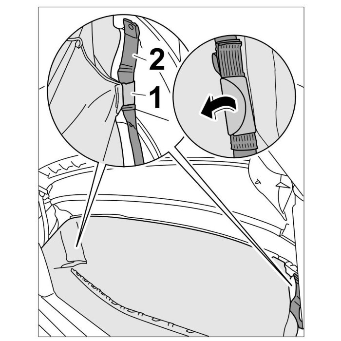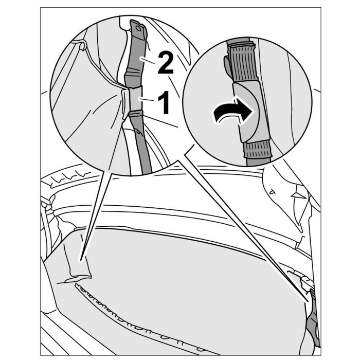 3. Pull tightening strip -1- outwards and engage with the third full slit over the ball pin on the main folding top bow -2- on right and left.