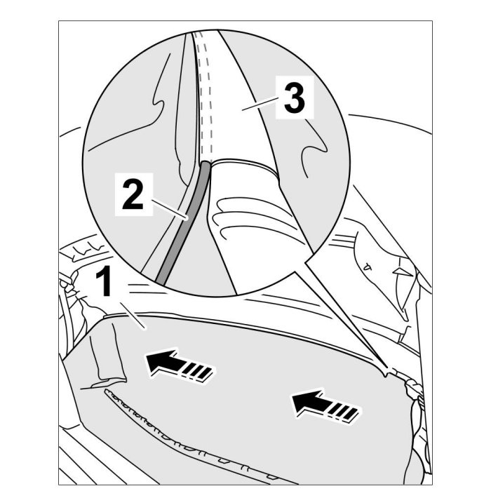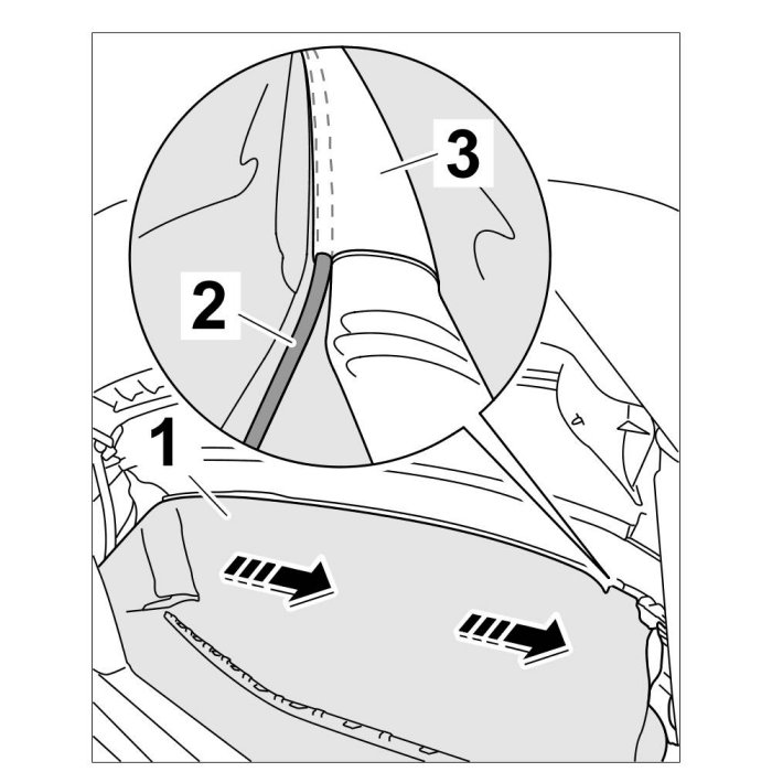 6. Pull out tightening strip -2- of roof liner -1- outwards from main folding top bow -3-.