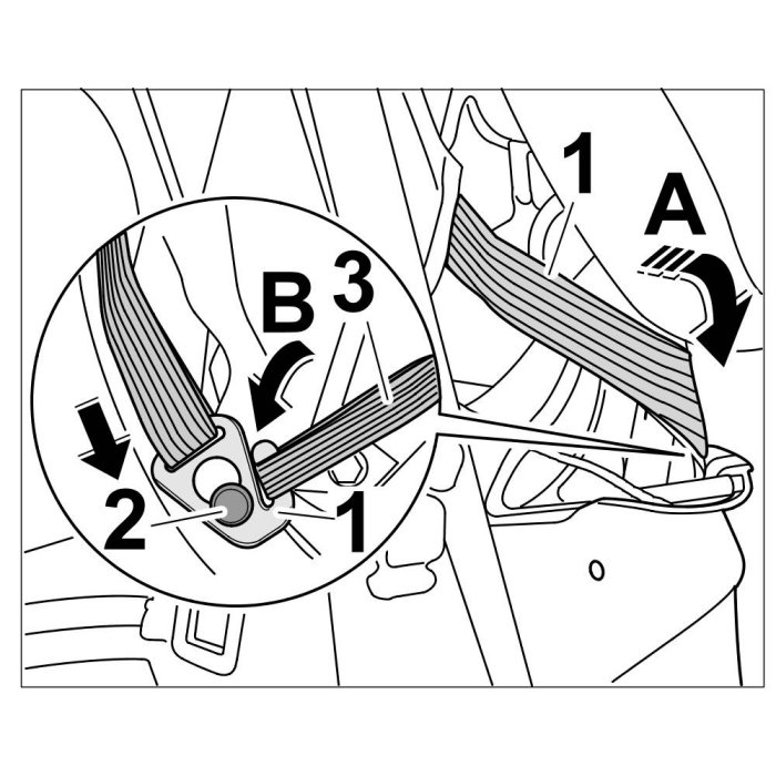 6. Engage retaining straps -3- left and right on hook of roof liner -1- -Arrow B-.