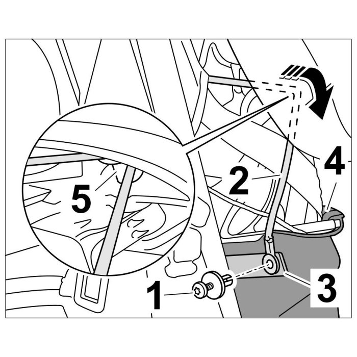 7. Thread cord on pin -5- at bottom -(inset)- , fit cord -2- in the fixing clip -1- and fasten metal pad -3- to convertible top support with water drip pan -4- (right and left).