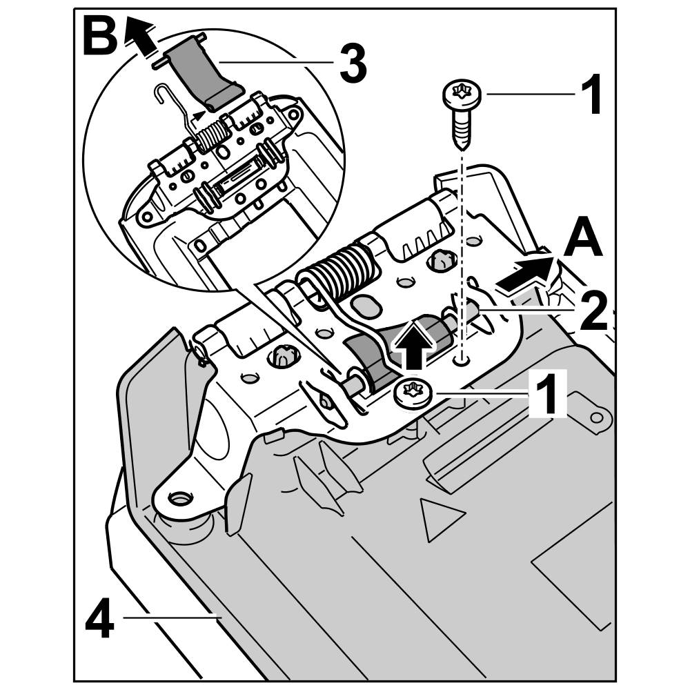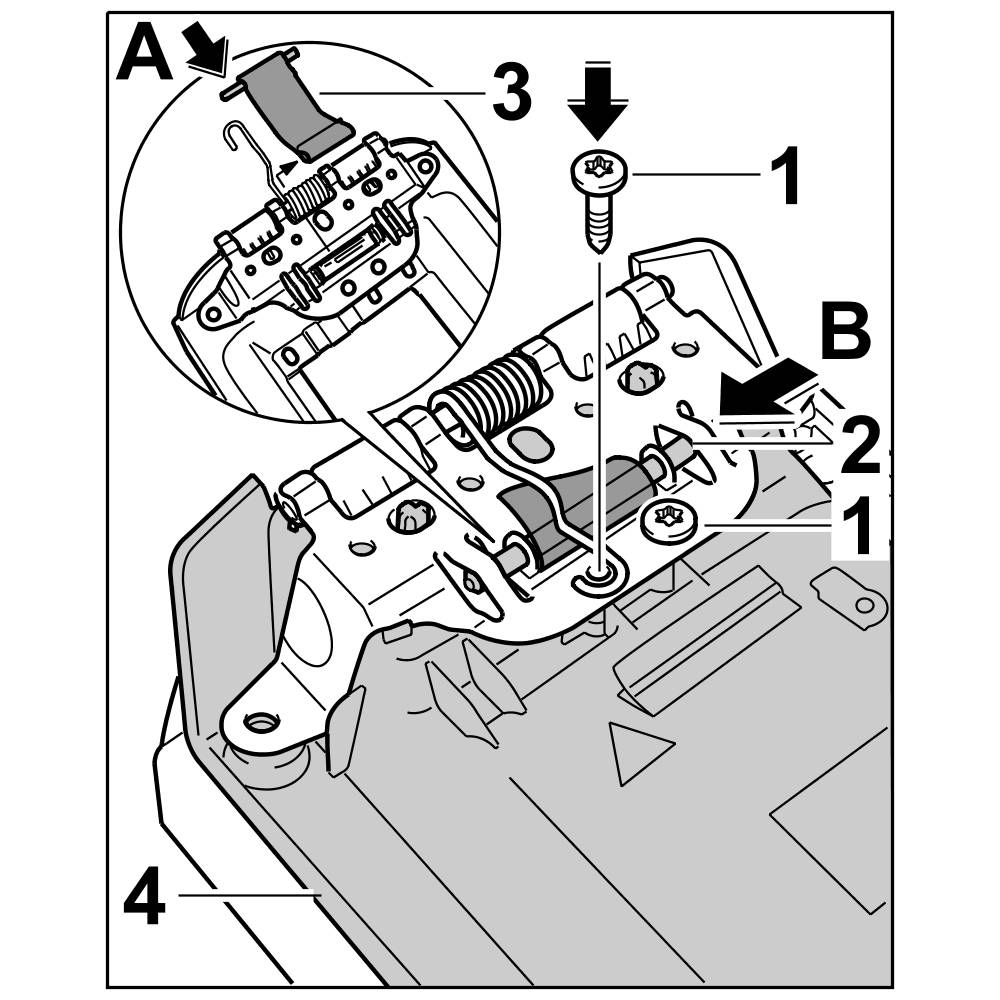 2.2. Push belt strap and retaining pin -3- through -Arrow A- , and push retaining pin -2- through hinge and belt strap -Arrow B-.